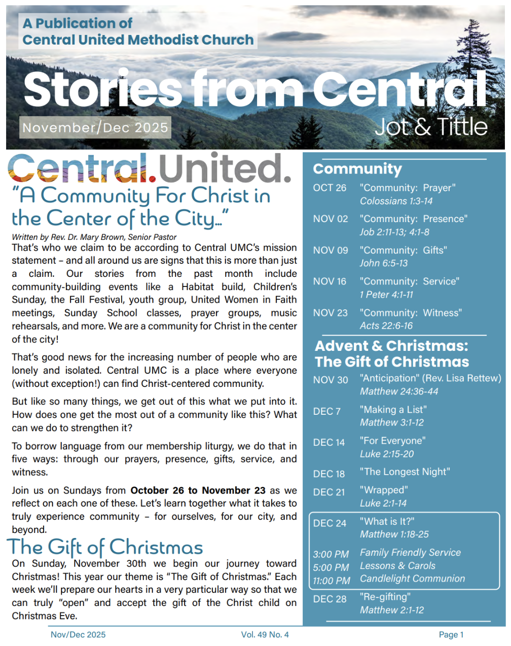 Our monthly printed newsletter offers stories from around Central, our community, and our ministries. You can pick up a copy at the church offices or click below to download an electronic version.